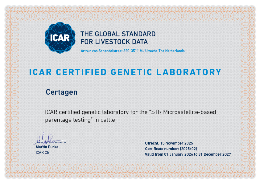 Das Dr. van Haeringen Laboratorium B.V. (VHL) und die Certagen GmbH sind vom ‚International Committee for Animal Recording‘ (ICAR) für die Durchführung von DNA-Abstammungsüberprüfungen basierend auf STRs akkreditiert. VHL ist auch für DNA-Profilen basierend auf SNPs akkreditiert.